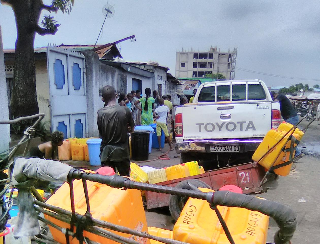 Une foule est perceptible matin midi soir à cet endroit. Sceaux, bidons, tonneaux et autres récipients sont déposés à même le sol. L'eau est payante à partir de 100 Fc à 1.000 Fc. La tension est palpable car chacun est pressé et ne veut laisser l'autre s'approvisionner en premier lieu. Les femmes sont plus nombreuses entourant le gérant qui distribue l'eau à l'aide d'un tuyau.