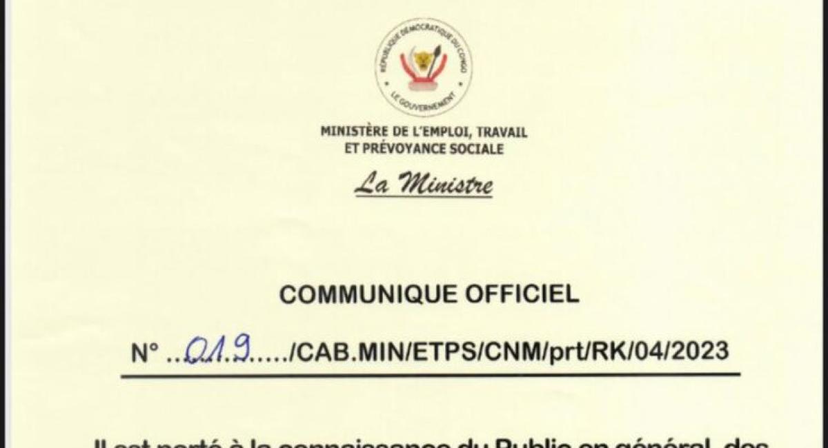 " Il est porté à la connaissance du Public en général, des Employeurs et des Travailleurs en particulier, qu’en exécution de l’Ordonnance n°23/042 du 30 mars 2023 fixant la liste des jours fériés légaux en République Démocratique du Congo, la journée du lundi 1er Mai 2023, "Journée Internationale du Travail ", est chômée et payée sur toute l’étendue du Territoire national ", peut-on lire dans ce communiqué officiel.