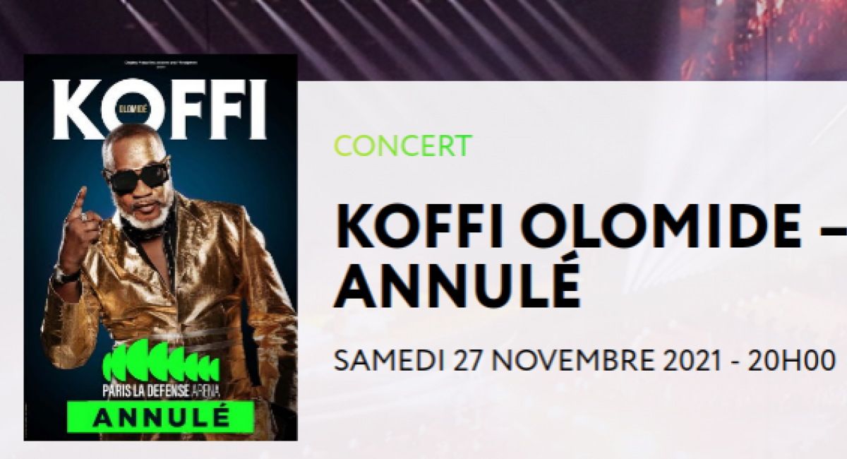 La grande salle de spectacle de Nanterre, Paris La Défense Arena a annoncé mercredi 20 octobre 2021, sur son site internet l'annulation du concert du musicien congolais Koffi Olomidé qui était prévu le 27 novembre 2021, pour raisons de "conséquences du Covid-19".