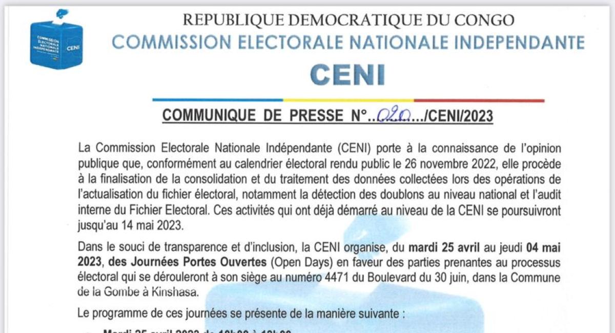 Par le biais d'un communiqué de presse parvenu à Lemag.cd , la Commission Électorale Nationale Indépendante (CENI) organise deux journées portes ouvertes ( open days) du mardi 25 avril au jeudi 4 mai 2023, en son siège, sise boulevard du 30 juin numéro 4471 dans la commune de la Gombe à Kinshasa.