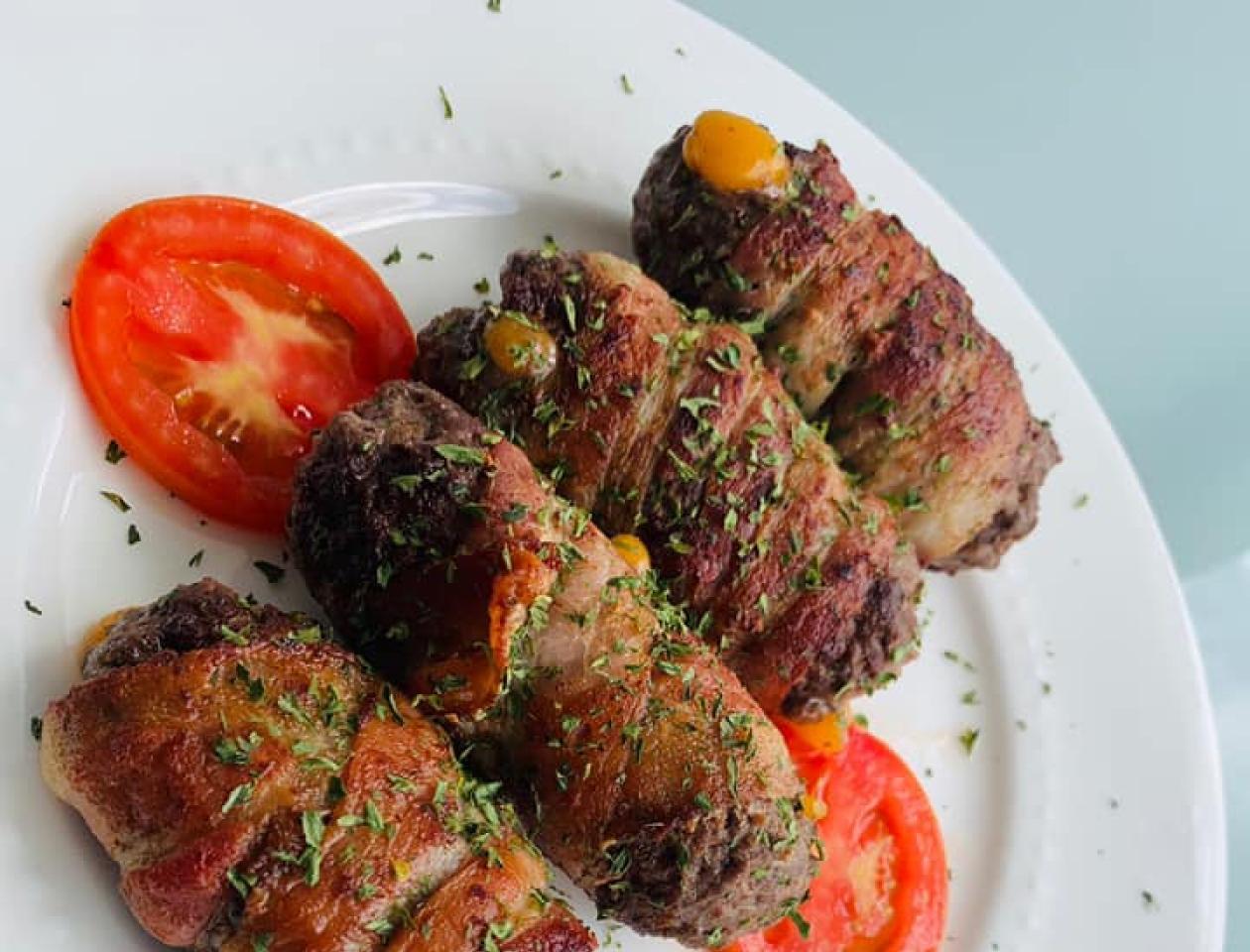 Commencer à préparer par couper le fromage en lamelles, assaisonner la viande hachée avec du sel, de l’oignon, de l’ail et du poivre noir. Séparer la viande en portions rond plat puis poser un morceau de fromage sur chaque portion de viande et les rouler. Prendre une tranche de bacon et la placer et envelopper le rouleau de viande. Répéter avec le reste des rouleaux.