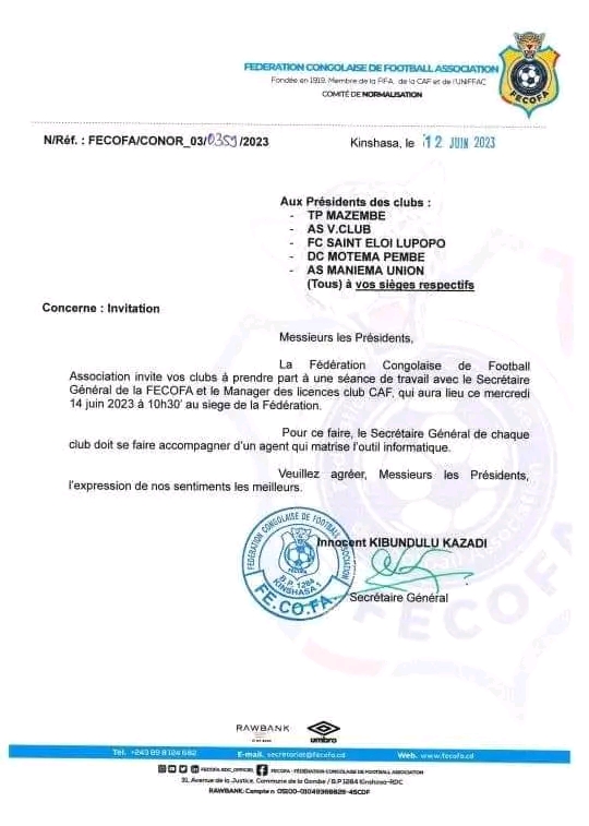 " La Fédération Congolaise de Football Association invite vos clubs à prendre part à une séance de travail avec le Secrétaire Général de la FECOFA et le manager des licences Club CAF, qui aura lieu le mercredi 14 juin à 10h30 au siège de la Fédération", renseigne la correspondance de l'instance technique du football en RDC.